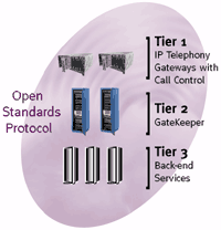 El sistema de telefonía sobre IP de clase carrier de 3Com se basa en una arquitectura abierta de tres niveles de gateways, gatekeepers y servidores de backend interconectados mediante protocolos abiertos basados en normas. La arquitectura modular de 3Com presenta APIs estándar en cada nivel a fin de brindarle a los carriers flexibilidad para personalizar el sistema, facilitando la diferenciación de servicios y la integración de las “mejores” aplicaciones de oficina back-to-back “de su clase”. Este sistema modular llave en mano basado en normas soporta la telefonía sobre IP de teléfono a teléfono y de PC a teléfono en redes conmutadas por paquetes.
